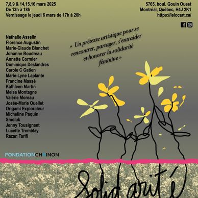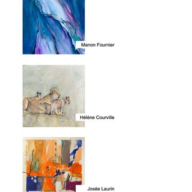 LES ARTISTES SONT: Annciella Alarie, Anne-Christine Diné, Annette Cormier, Annie Sène, Carole Ouimet (CWOL), Fettouma Feghir, Ghislaine Demers, Laurent Rousseau (Lo), Lise Tessier (Tess), Louise Malouin, Marie-Marcelle Vézina, Natalee, Rita Moreau, Suzanne Savard (Zet)