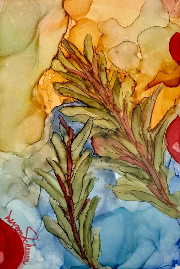 L’oeuvre ci-jointe a été créée par Lynne Scheuer (2025, encre acrylique sur papier Yupo).